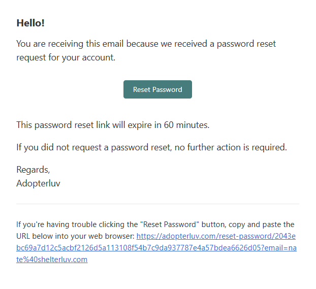 Be on the lookout for an email from help@shelterluv.com with the subject line Reset Password Notification. Click the green Reset Password button in the email to create a new password for your Adopterluv account.